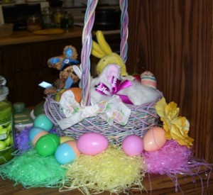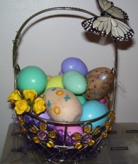 Simply place all symbolic items in basket in an aesthetically pleasing way. If desired, decorate eggs for Ostara fun and add to decorations.